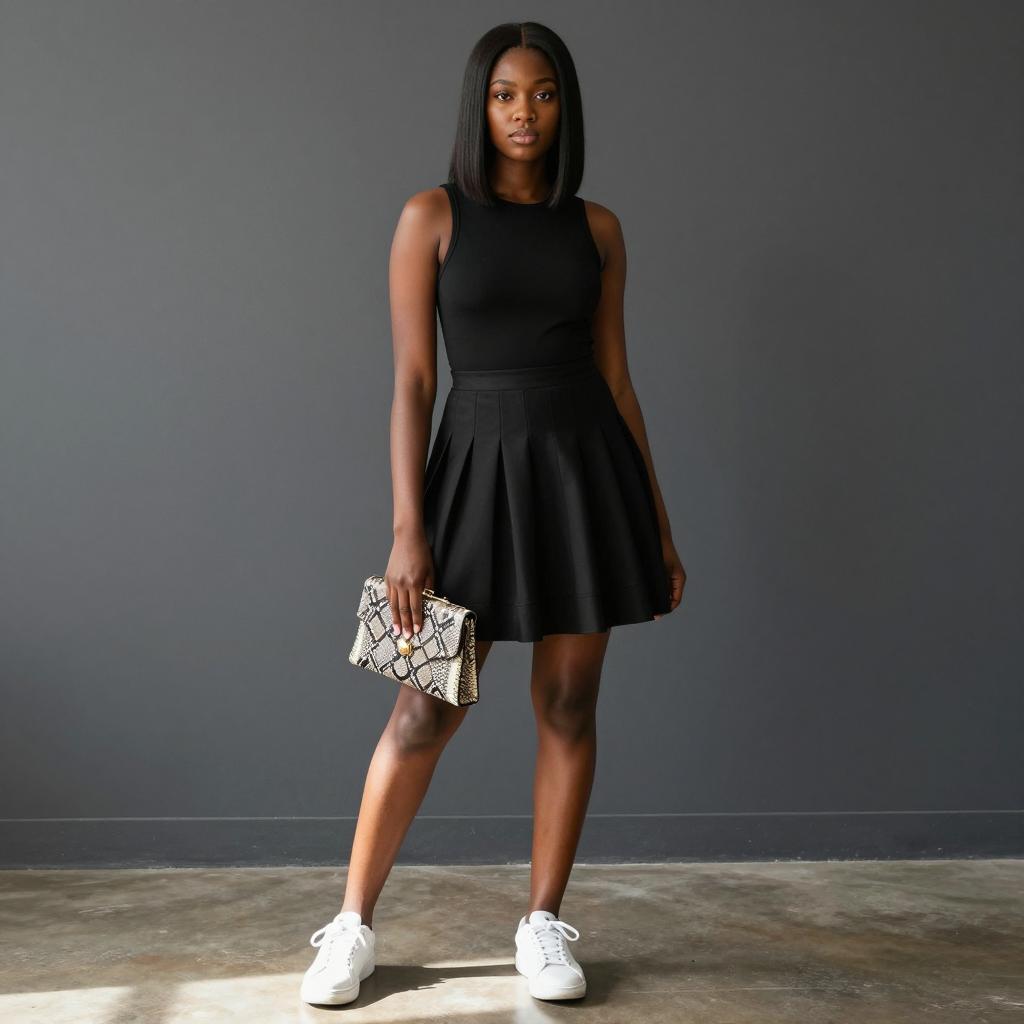 Black woman with straight black hair wearing a sleeveless black top and black pleated skirt. She holds a small snakeskin-patterned clutch in her right hand. She stands with legs slightly apart, wearing white sneakers. Dark gray wall and ured floor in the background. She has a neutral expression. Single person. Sunlight casts shadows on her legs.
