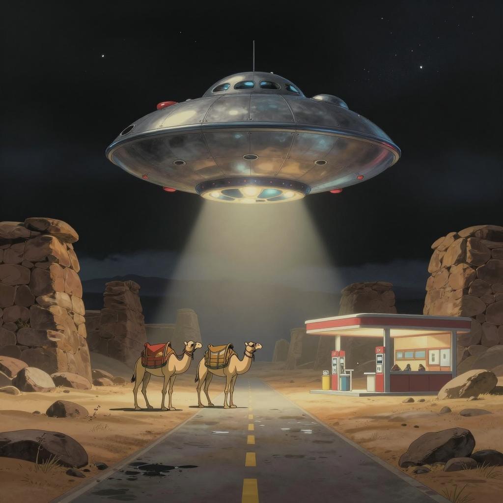 Studio Ghibli Style UFO and Camels at Desert Gas Station