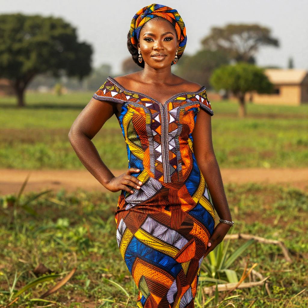 Nigerian woman body shape portrayed in vibrant traditional attire, standing confidently against a backdrop of lush African landscape, highlighting natural curves and cultural elegance, photorealistic style with warm, rich colors and detailed textures.