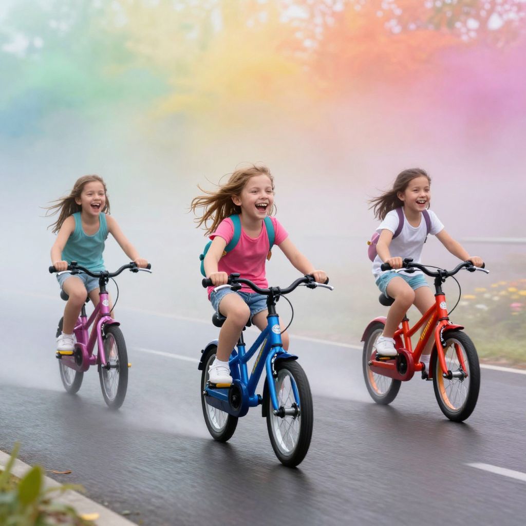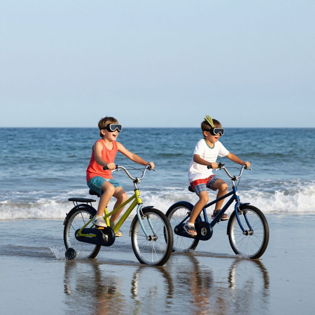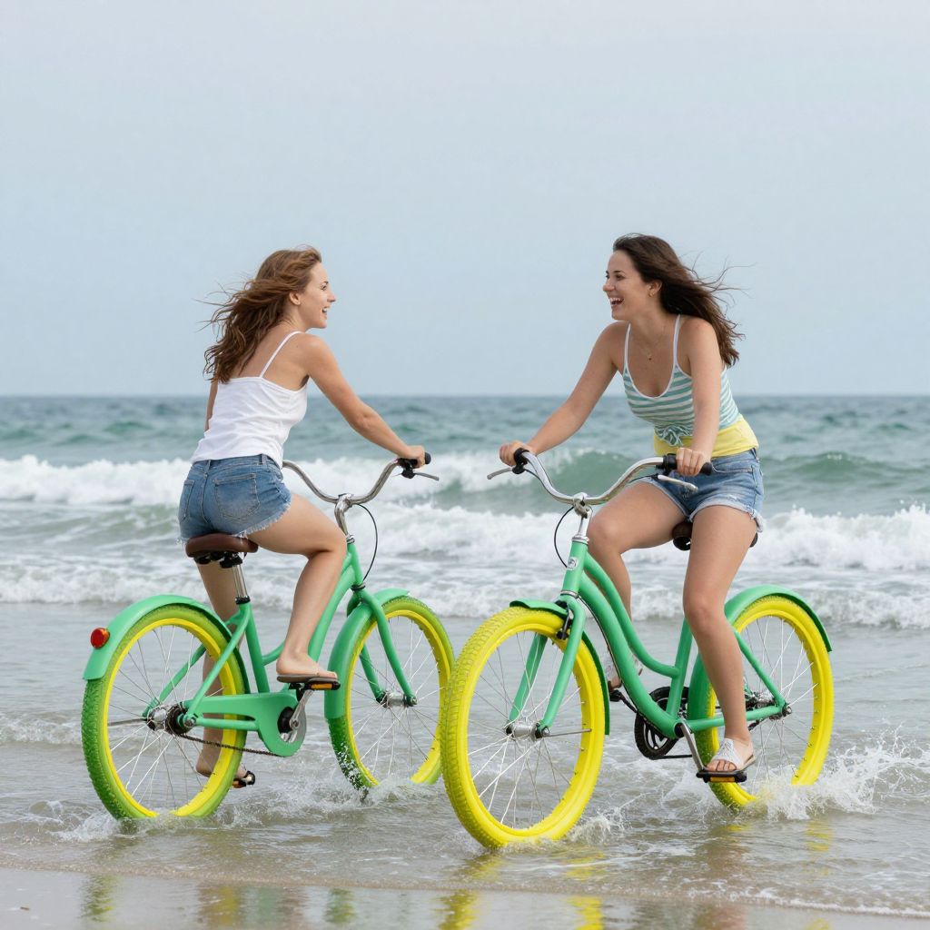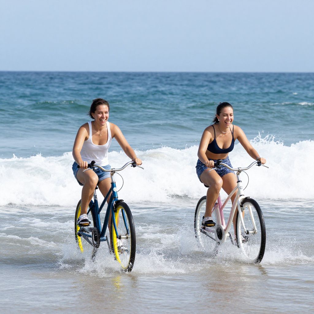 Two riders navigate the rhythmic dance of sea and sky, their laughter echoing the boundless freedom of the ocean, as vibrant bicycles glide over waves, symbolizing the harmonious blend of human joy and natural grace.