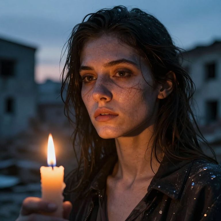 Create an ultra-realistic portrait of an enigmatic artist during twilight hours, illuminated by flickering candlelight casting deep shadows across her face. Capture a low-angle perspective through a vintage lens, focusing on the intricate details of her brush strokes and nuanced expressions etched in her lined visage. The background should blend abstract elements of a semi-destroyed cityscape, conveying isolation yet connection to urban decay while reflecting resilience and artistic spirit.