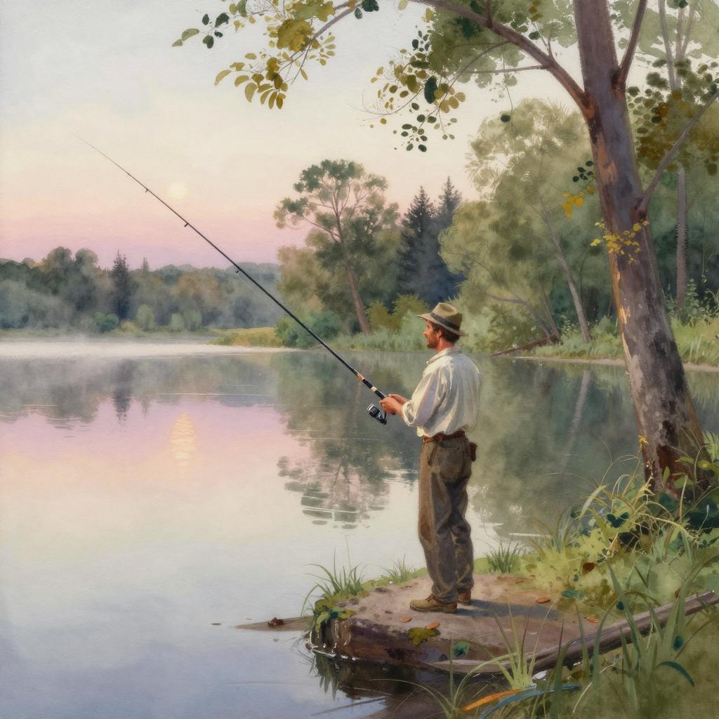 A watercolor painting depicting a man fishing by a calm lake at dawn. The scene features soft early morning light with pastel shades reflecting on the water, surrounded by trees and greenery. The man wears a hat and casual clothing, standing on a grassy bank with fishing rods in both hands. The tranquil landscape and delicate brushstrokes are inspired by John Singer Sargent and Andrew Wyeth.