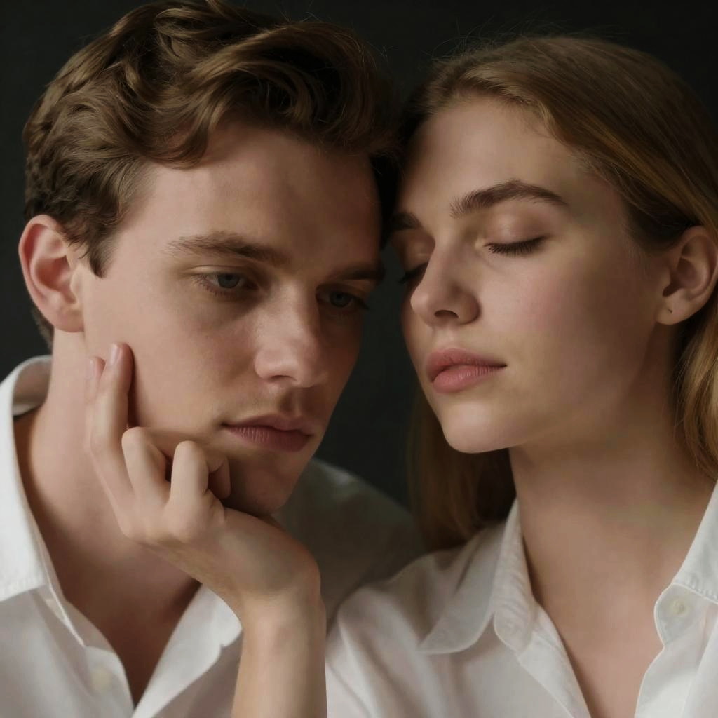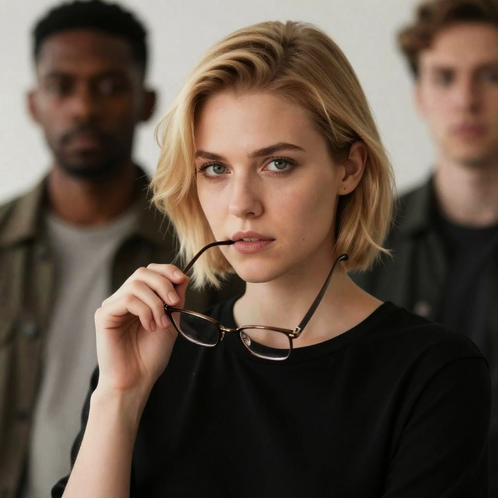 Photograph of five people. Central figure: blonde woman with blue eyes, resting chin on hand, blue jacket, intense expression. Surrounding: man in checkered shirt, serious; woman in green, neutral expression; man with dark hair, profile, focused; woman in profile, blonde, contemplative. Background blurred. Central woman's hand touches right figure's face.