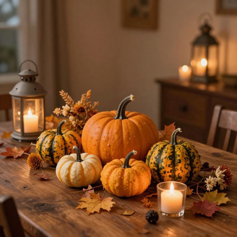 Autumnal photograph of a wooden table adorned with orange, yellow, and white pumpkins, lanterns, candles, and autumn leaves. Warm,
