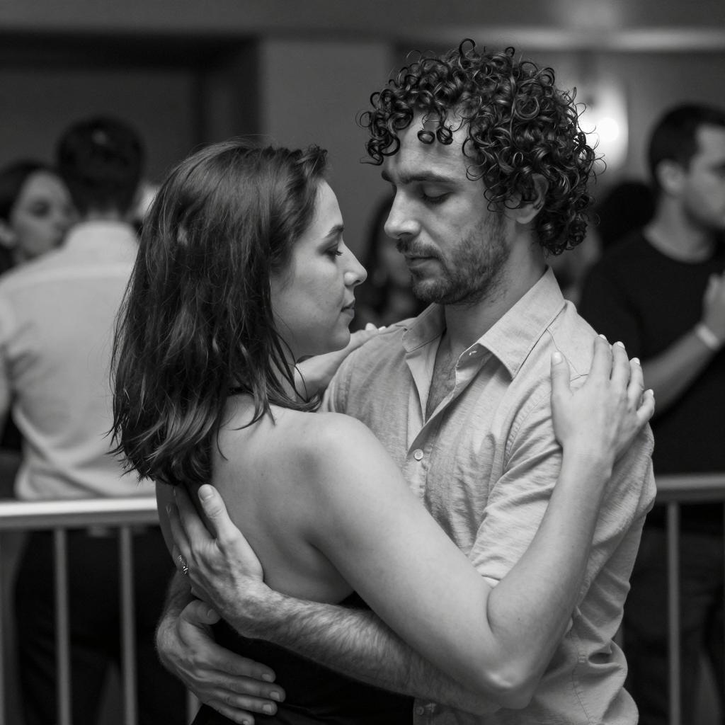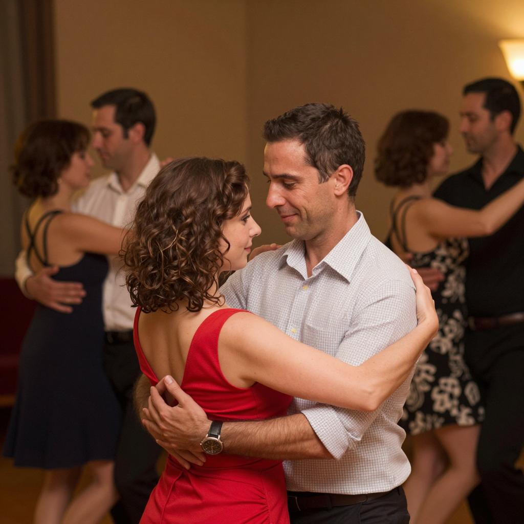 Man in white checkered shirt and woman in red dress dancing closely in dimly lit room, arms around each other. Other couples dancing in background. Warm, yellow lighting. Five people visible. Man smiling, woman smiling slightly. Background blurred.
