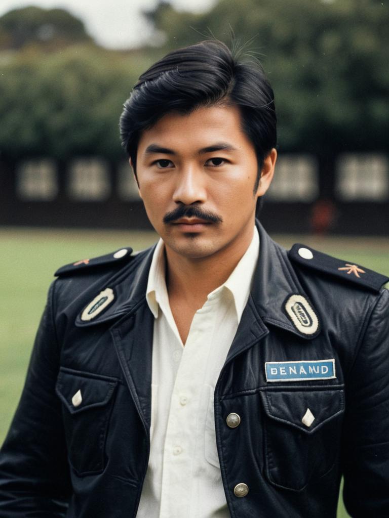 Portrait of an Asian man with short black hair and a mustache wearing a black leather jacket with epaulettes and a white collared shirt underneath. He is outdoors with a blurred green background, looking directly at the viewer. The jacket features buttons, front pockets, and a name patch reading 'BENAUD'.