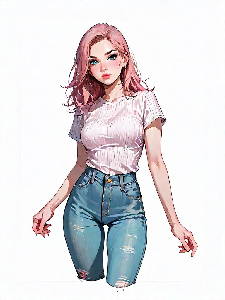 1girl, source_comics, realistic face, full body shot, Woman, casual summer, sleeveless crop top with floral pattern in hues of pink, blue, and yellow, high-waisted striped shorts in white and light blue, frontal button-up detail, gold watch on the left wrist, multiple thin bracelets on the right, white seamless background.