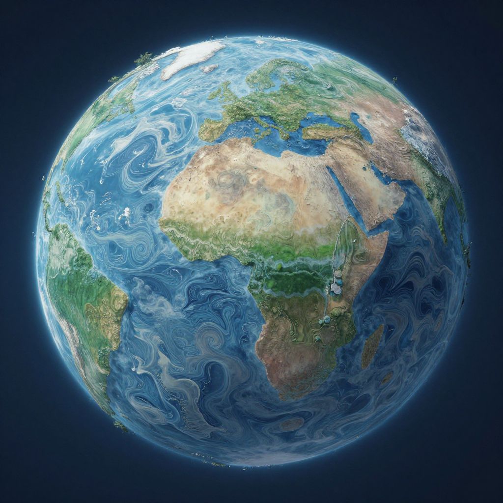 Skindentation prompt: A surreal landscape of a giant, living planet with surface indentations resembling human skin, filled with swirling patterns and vibrant blues and greens. The scene captures both geological formations and biological fluidity in a dreamlike, fantasy art style.