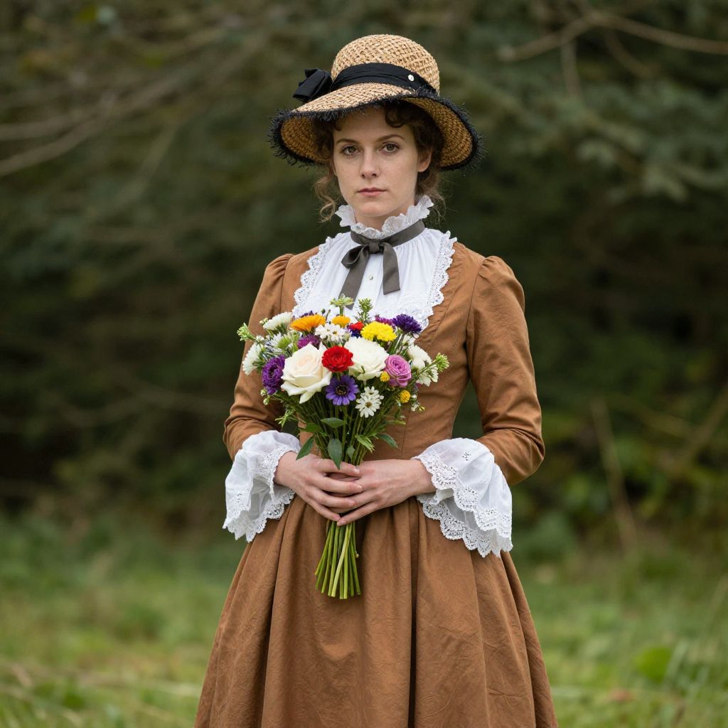 Victorian Flower Seller Costume, woman in a brown skirt and hat holding a bouquet of flowers