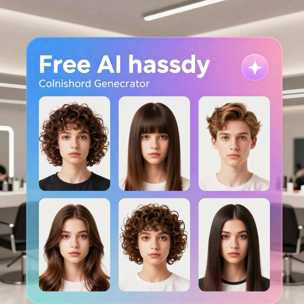 Free AI hairstyle generator interface with futuristic holographic displays, various hairstyle options digitally transforming on a model's head, sleek modern UI elements, vibrant colors and smooth gradients showcasing diverse hair textures and styles in a virtual salon environment.