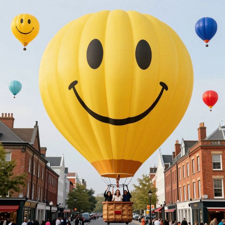 Enormous smiley-shaped hot air balloons, painted in vibrant yellow with bold black features, gracefully float above a bustling urban landscape, lifting a basket filled with three joyful passengers as smaller colorful balloons dot the sky amidst historic brick buildings and lively street scenes below.