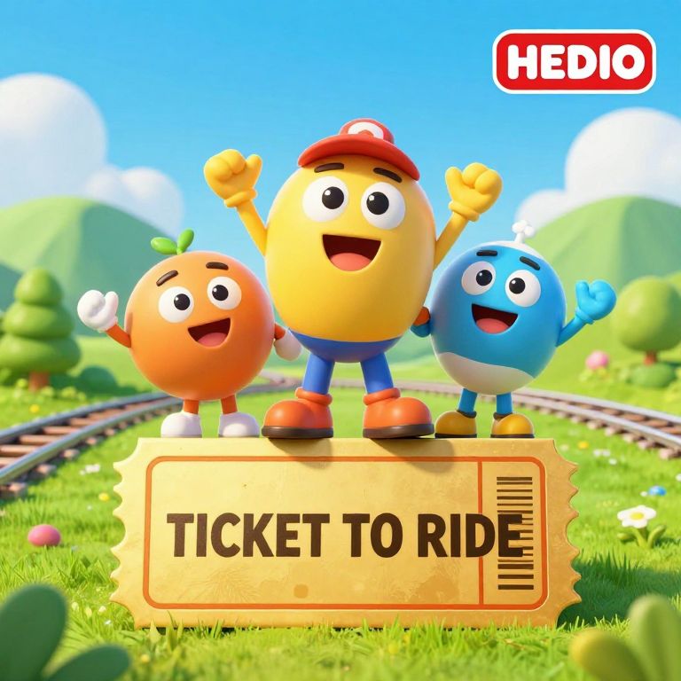 Cheerful cartoon characters stand triumphantly atop a golden ticket labeled 'TICKET TO RIDE,' set against a vibrant backdrop of green hills, blue sky, and a winding railway track, with the 'HEDIO' logo prominently displayed in the corner.