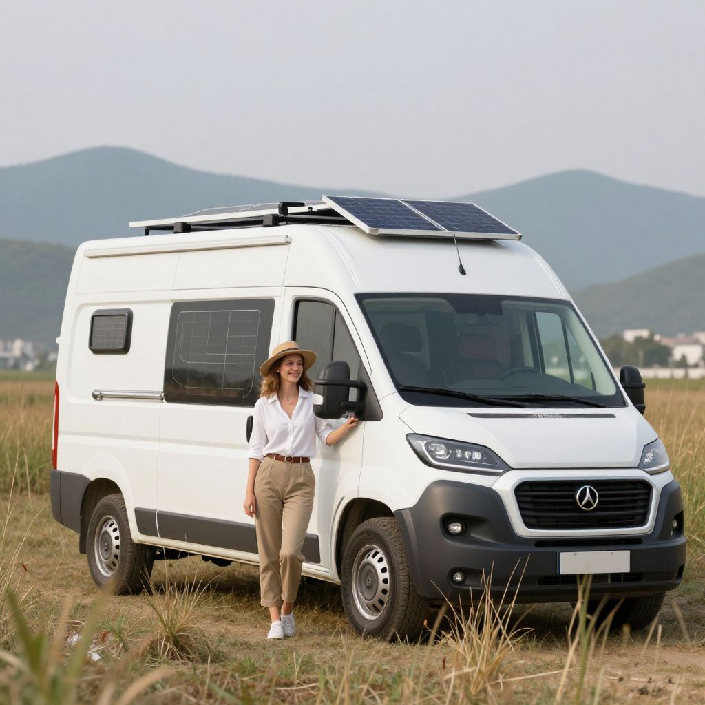 White camper van equipped with solar panels on its roof stands parked in a serene field, surrounded by tall grass and distant mountains, as a smiling woman in casual attire stands to its left, embodying sustainable travel and outdoor adventure.