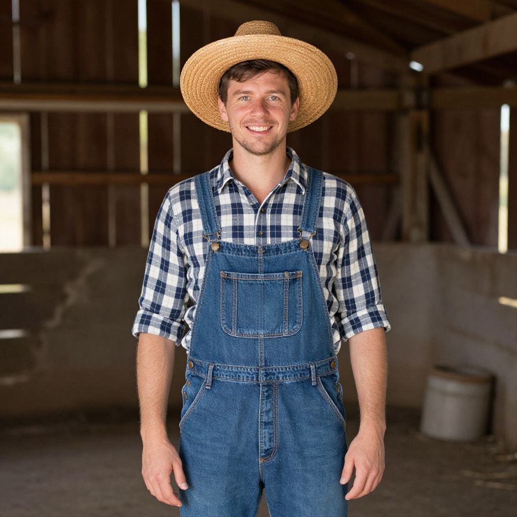Farmer Book Week Costume, man in a straw hat and overalls standing in a barn