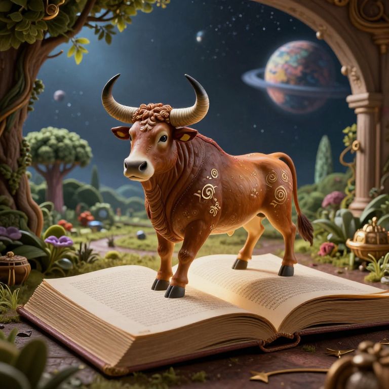 A 3D bull of the zodiac sign, emerging from the pages of a book on astrology, illuminates a scene inside a house on a distant planet with a view of the Garden of Eden, featuring intricate details and hyper-realistic lighting.