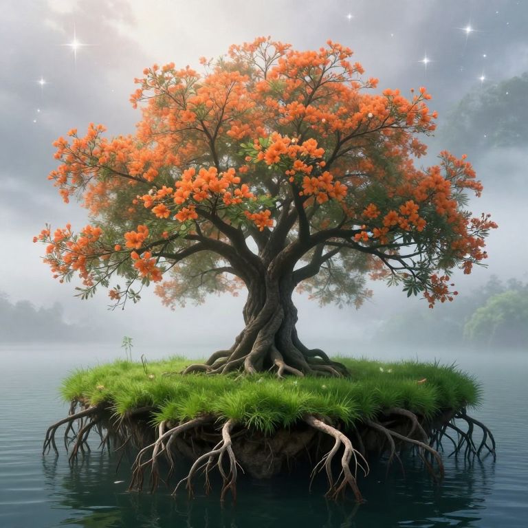 Majestic trees stand rooted on a suspended island of vibrant green grass, their sprawling roots extending outward into the dark waters below, while delicate orange blossoms bloom against a backdrop of ethereal light filtering through a misty, star-dusted canopy.