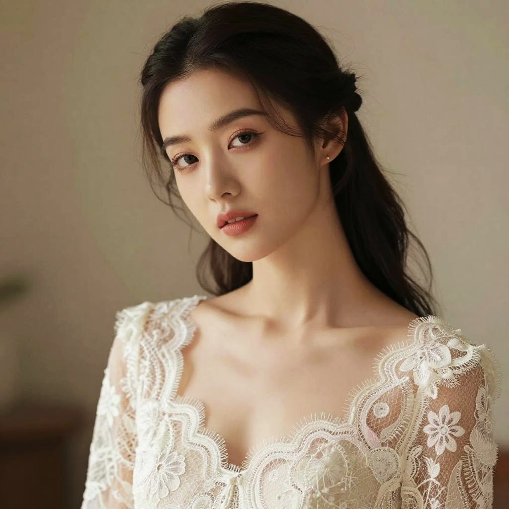 A captivating woman poses elegantly in a soft, floral setting, wearing a stylish attire that features intricate lace details and flowy sleeves. The serene ambiance is enhanced by blooming flowers and lush greenery, creating a perfect backdrop for this artistic portrait.
