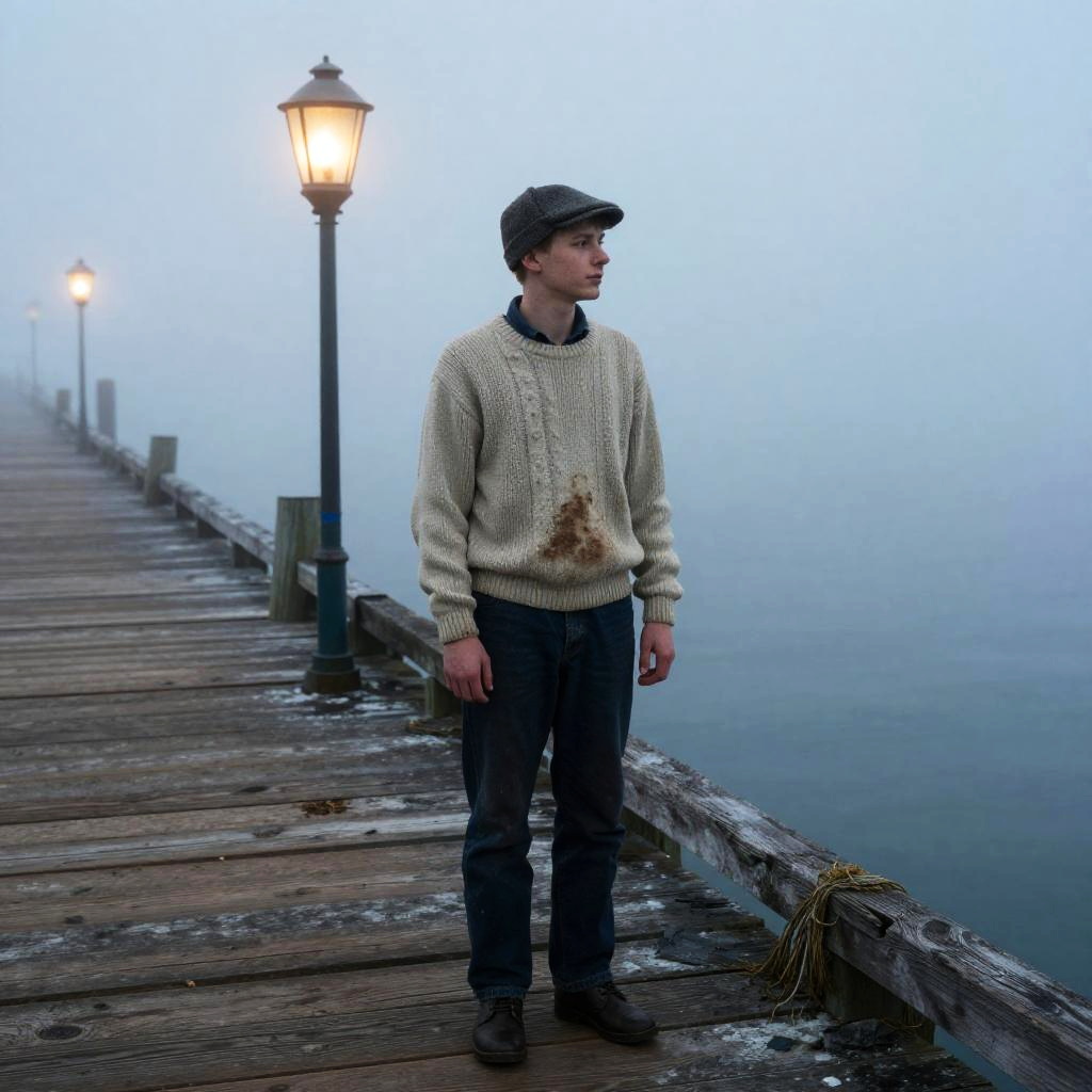 A young man in a well-worn fisherman sweater and wool cap standing in a fog-laced harbor pier with creaking wooden boards, illuminated by pale lantern light cutting through sea mist. The scene evokes a lonely, weathered and contemplative mood, reminiscent of classic film styles, featuring rich colors and deep storytelling elements.