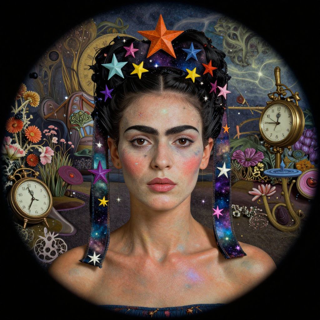 A surreal portrait depicting an ethereal celestial being, reminiscent of the imaginative styles of Kahlo and Dali, showcases an otherworldly woman with her hair adorned in vibrant stars resembling cosmic ribbons cascading down her shoulders. The scene is observed from a bird's eye view, as if captured through an interstellar telescope, highlighting the intricate facial details and celestial markings against iridescent skin tones. Surrounded by a shimmering landscape filled with surreal flora and melting timepieces, this enchanting composition transcends the limits between reality and fantasy, evoking a sense of wonder and magic.
