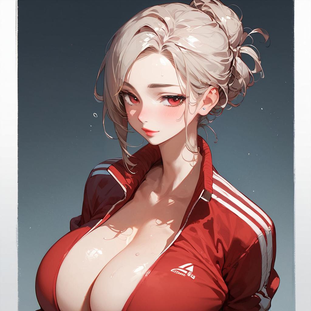 1girl, long_hair, solo, blush, blue_eyes, braid, bangs, side_ponytail, heterochromia, grey_hair, looking at viewer, red_jacket, track_jacket, track_suit, cleavage, cowboy shot, score_9, score_8_up, score_7_up, anime coloring, source_anime, anime
