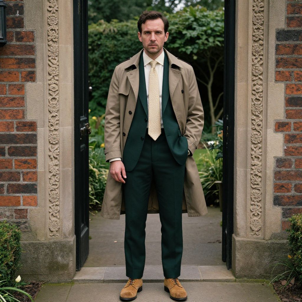 A man, dark green suit, ivory dress shirt, textured silk tie, modern khaki trench coat, tan suede derby shoes, historic brick exterior, intricate stone carvings, lush garden entrance, Holga camera style, contemplative expression. Man has masculine face and piercing eyes