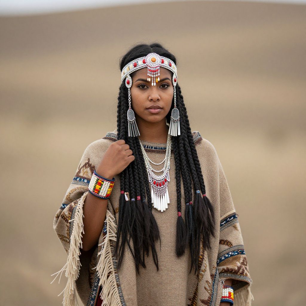 Photograph of an African woman with long braids, wearing intricate silver jewelry, a beaded headband, and a beige traditional garment, standing in