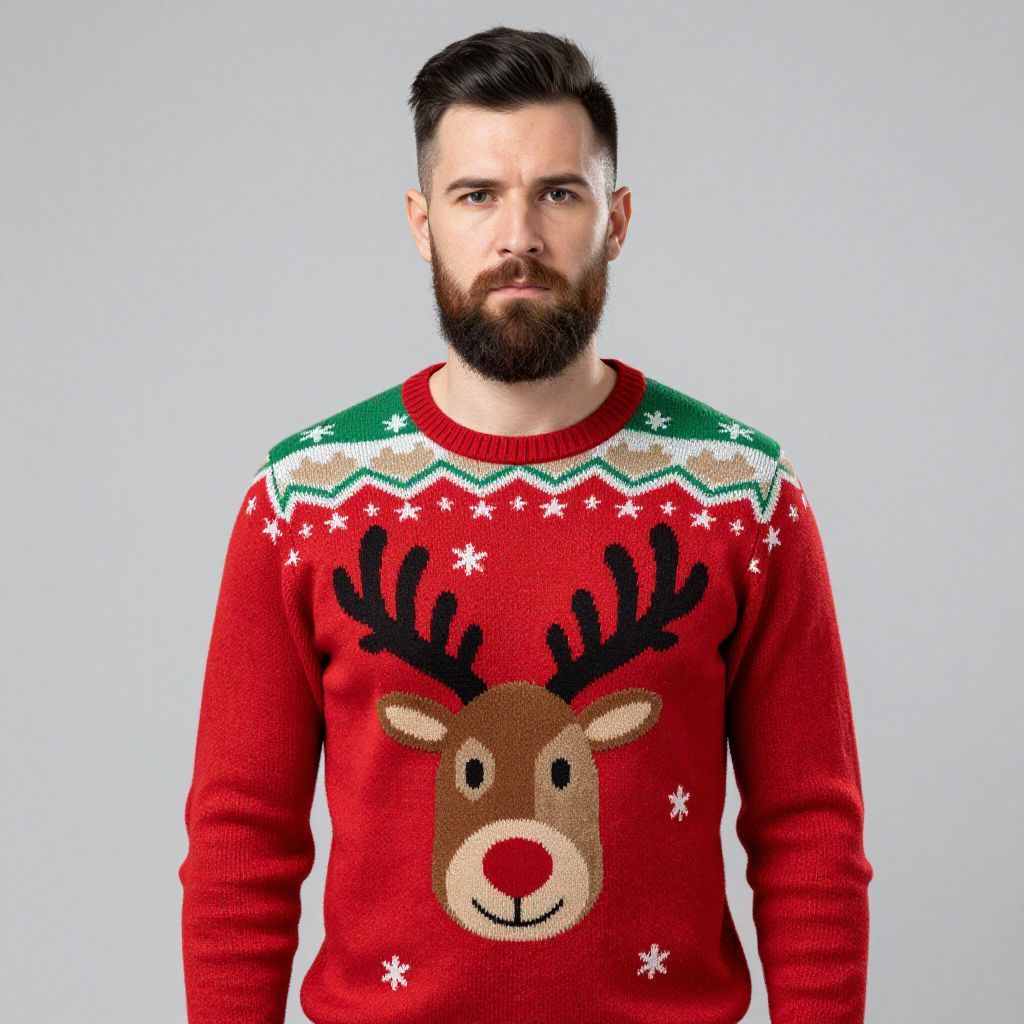 Photograph of a bearded man with short, dark hair, wearing a red Christmas sweater with a reindeer design on the front and green and white patterned shoulders. The reindeer has brown fur and black antlers. He has a serious expression and is standing against a plain gray background. The sweater's texture looks knitted and cozy.