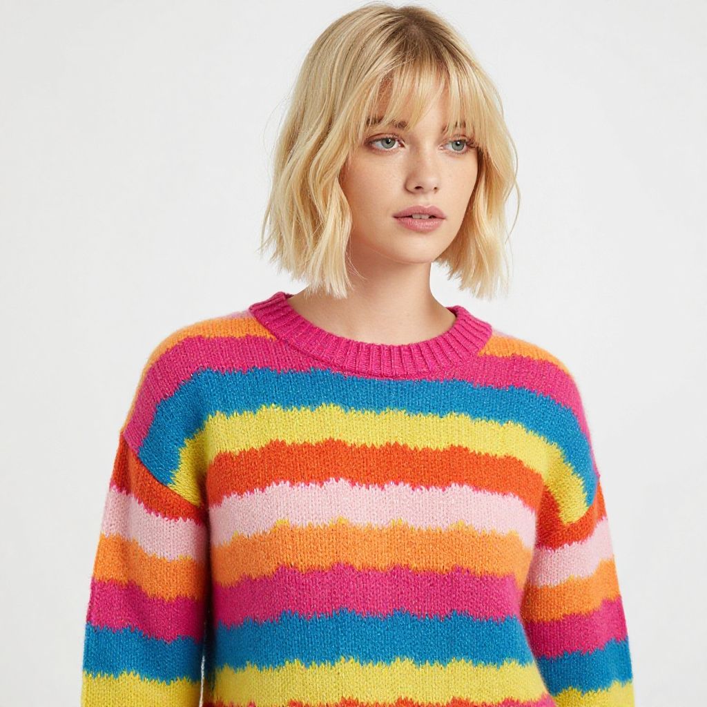 This vibrant image features a woman with a stylish blonde bob haircut, showcasing a cozy, colorful knitted sweater with bold stripes. The bright colors and modern fashion style evoke a cheerful and trendy atmosphere, perfect for marketing clothing or lifestyle products.