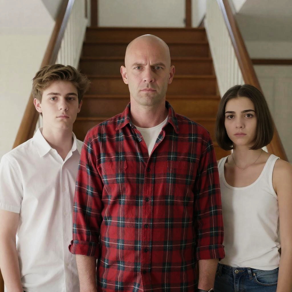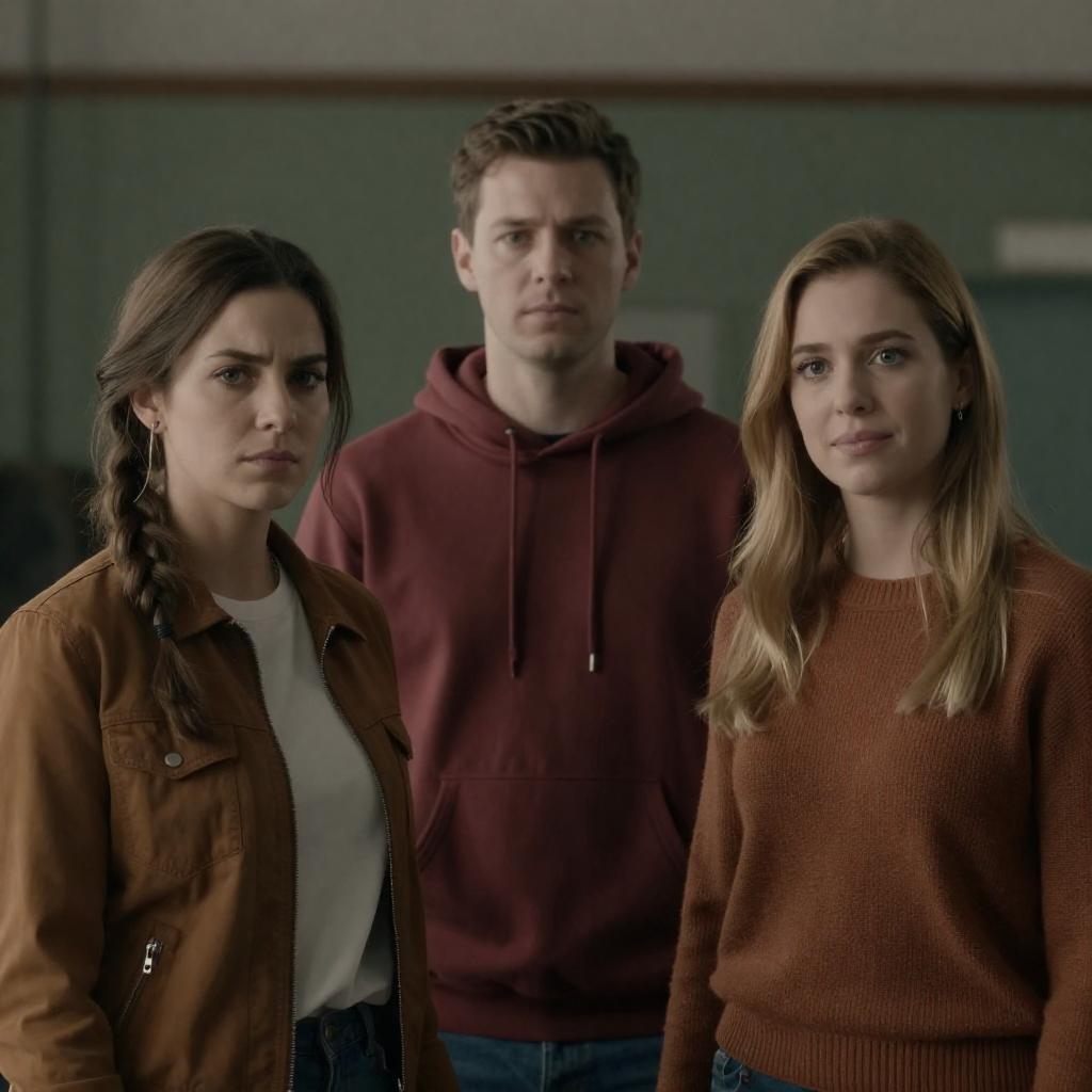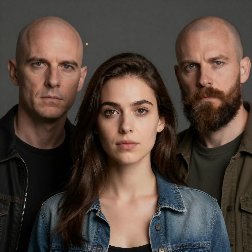 Photograph of three people on a couch. Central man, bald, wearing black hoodie, leans forward with hands clasped. Left man, short brown hair, green shirt, relaxed pose. Right woman, brown hair, denim jacket, neutral expression. Patterned brown couch, beige wall, abstract black and white artwork above. Soft lighting.