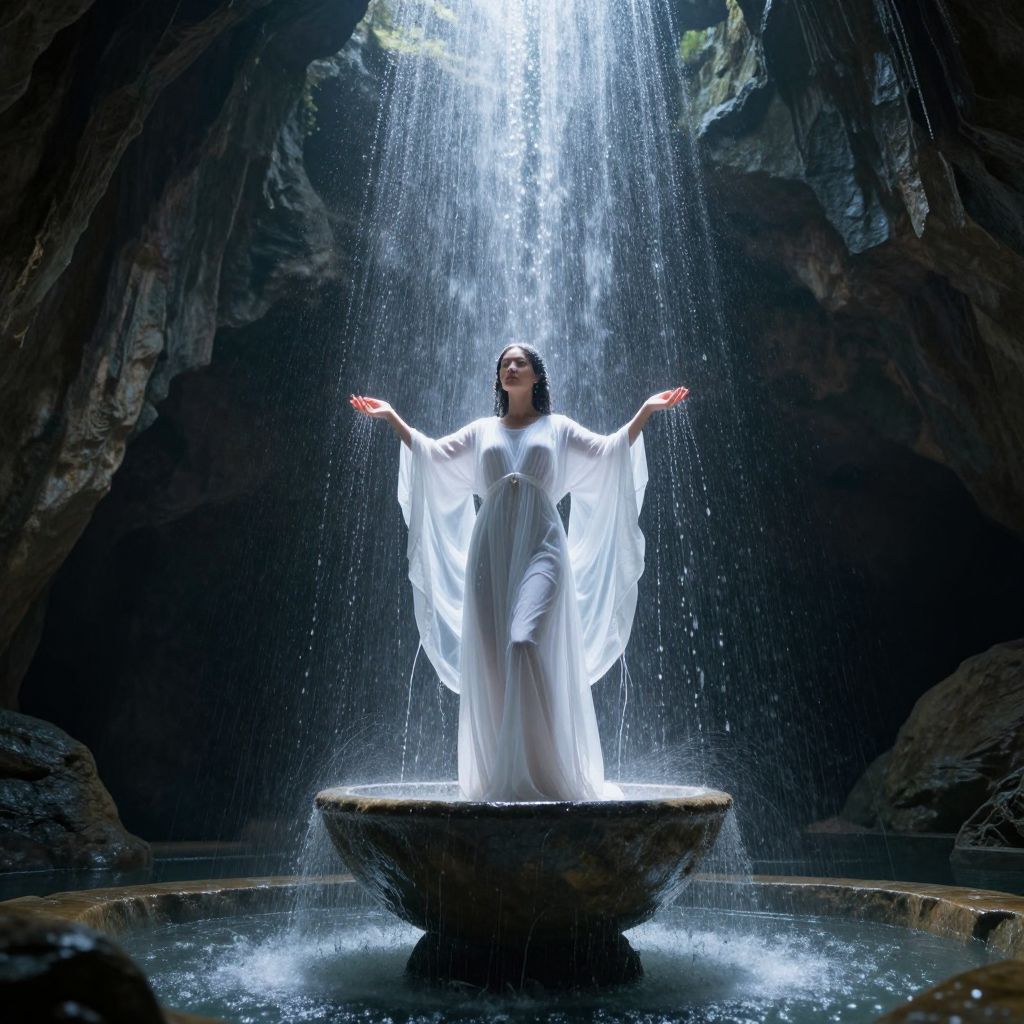 A woman in a flowing white gown stands gracefully atop a large stone bowl in a dark cavern with water cascading down around her. She has her hands outstretched as the mystical light beams down from above, illuminating the serene and ethereal atmosphere inside the rocky cave.