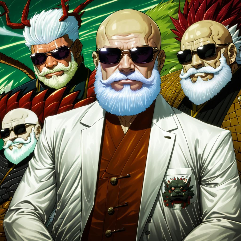 Muten roushi, dragon ball, 1boy, beard, mustache, white hair, sunglasses, bald, old man, by artist sei (kaien kien), anime