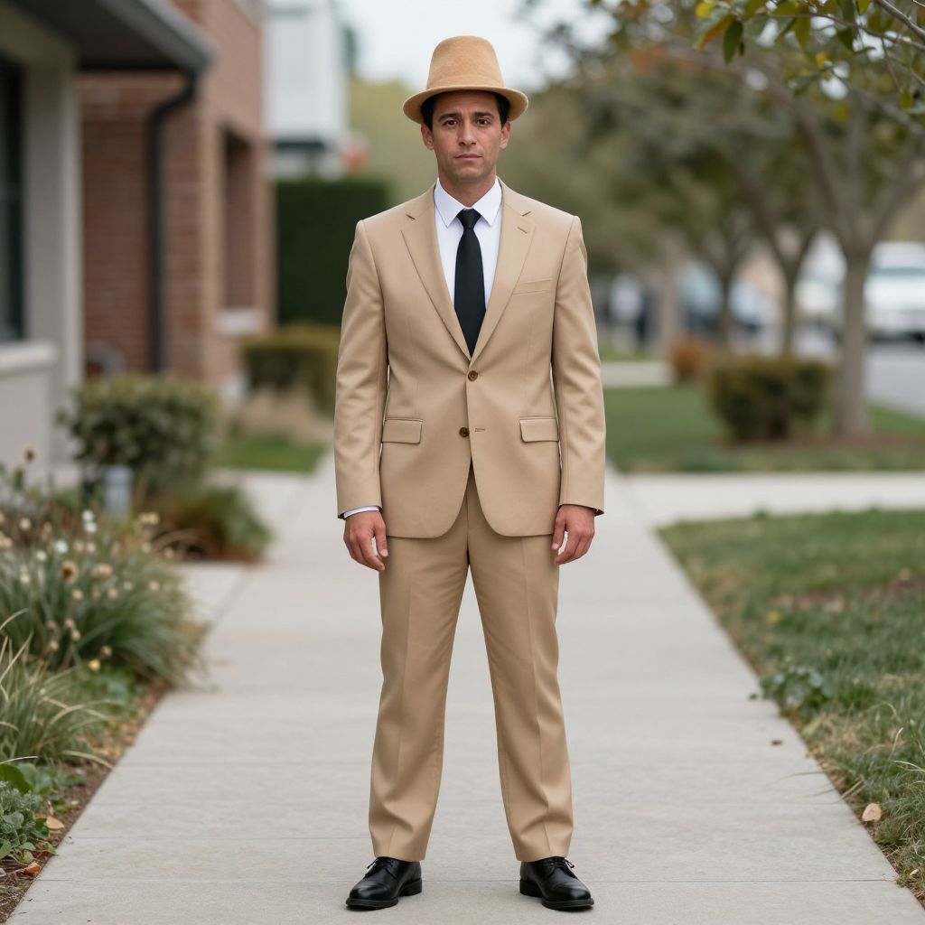 Funny Party Costume, dressed in a tan suit and hat standing on a walkway