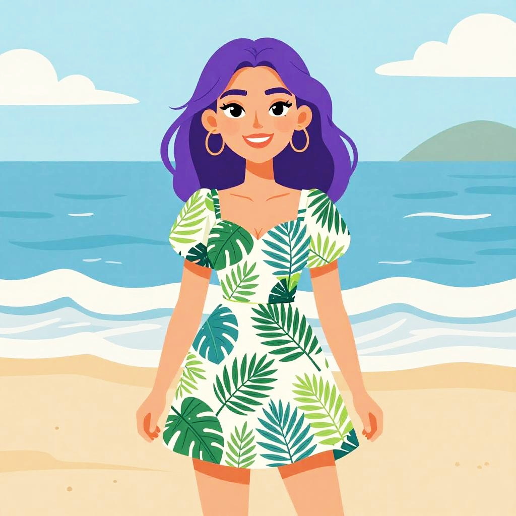 Digital illustration of a smiling woman with purple hair, wearing a green leaf-patterned dress, large hoop earrings, standing on a sandy beach with blue ocean