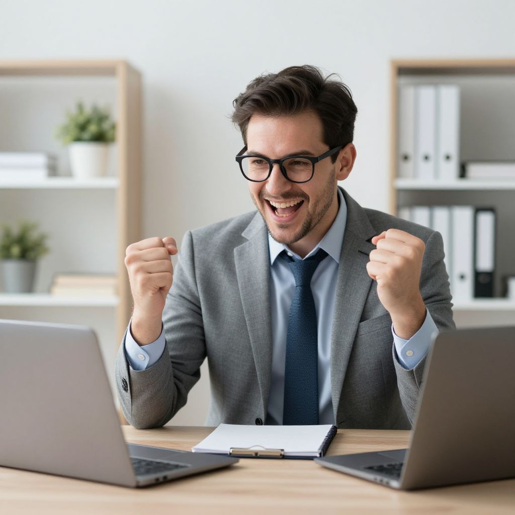 Photograph of a smiling, dark-haired man with glasses, wearing a gray suit, light blue shirt, and dark blue tie, sitting at a wooden desk with two laptops in front of him. He is clenching his fists in excitement. The background features blurred white shelves with potted plants and black binders. The man's expression and body language suggest he is celebrating a successful outcome. The image is brightly lit with a modern office setting.