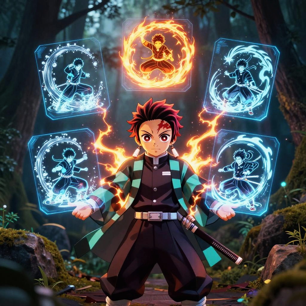 Futuristic demon slayer breathing style generator, holographic displays of elemental breathing techniques, swirling water, fire, thunder, and wind patterns, sleek samurai armor glowing with energy, held in a dark enchanted forest setting with luminous particles