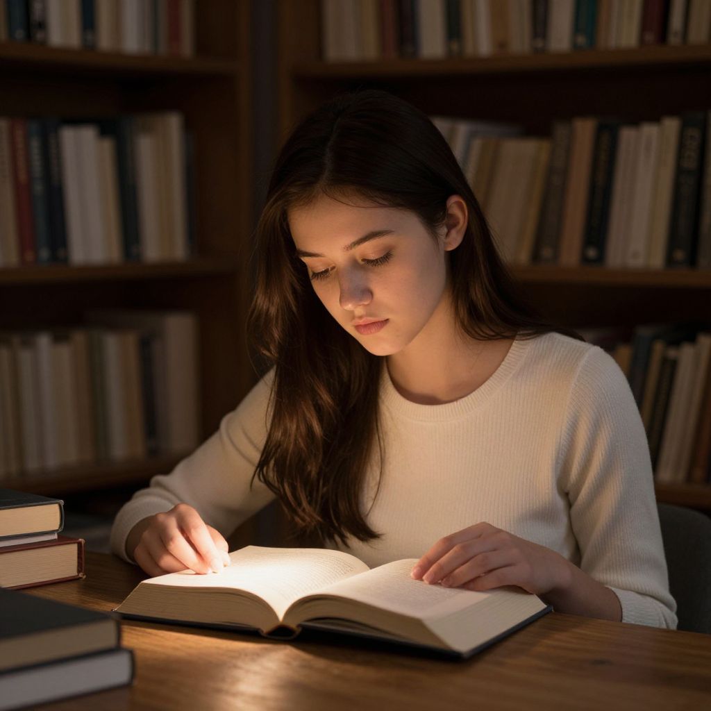 Photograph of a young woman with long, dark brown hair and fair skin, sitting at a wooden table in a dimly lit library. She is wearing a white, long-sleeved sweater and intently reading an open book illuminated by a focused light. Her eyes are cast downward, and her right hand is touching the page. The background features dark wooden bookshelves filled with books. Two closed books are stacked on the table to her left, with their spines facing forward. The lighting creates a warm, cozy atmosphere.