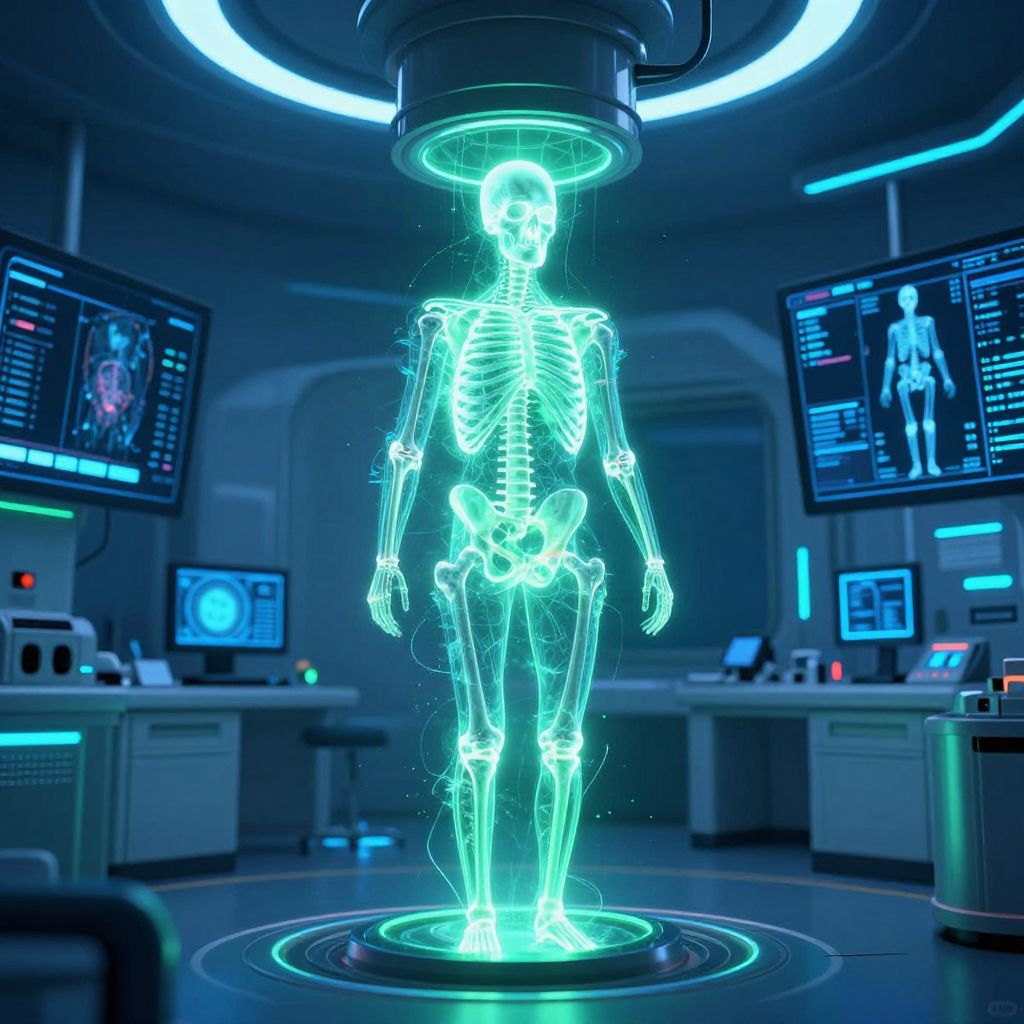 Neon-green holographic human skeleton standing in futuristic medical lab, surrounded by glowing screens and high-tech equipment. Sci-fi digital art.