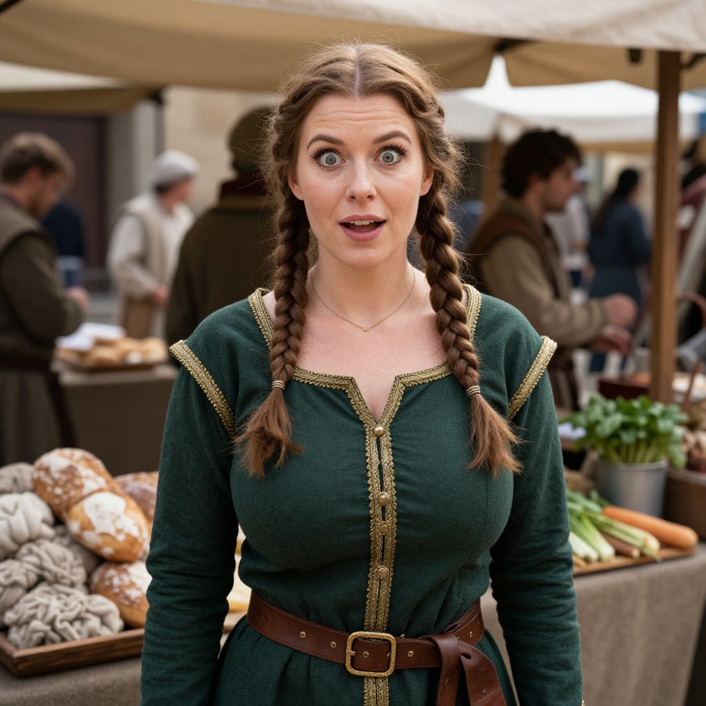 A realistic scene of a medieval woman in a full costume — dark green doublet with gold trim, hanging braids, and a leather apron — standing in a marketplace with stalls of wool, bread, and herbs, her face lively with curiosity, eyes wide and sharp, wearing natural-looking makeup, and sunlight highlighting her features in the bustling medieval town setting. The woman has big tits and cute face