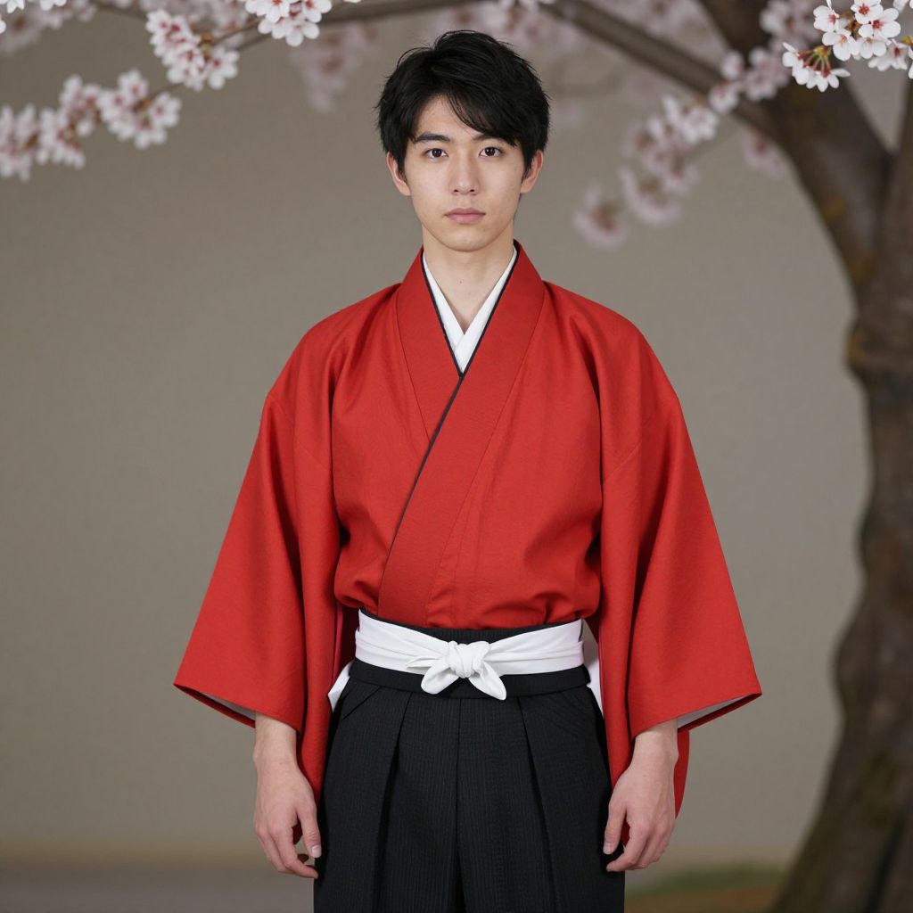 A young Japanese man stands confidently in a traditional setting, wearing a vibrant red kimono with elegant white accents along the sleeves and collar, paired with sleek black pants. His expression is calm and composed, with soft eyes that convey wisdom and quiet strength. The scene is softly lit, with a subtle backdrop of cherry blossoms in the background, enhancing the serene and cultural atmosphere.