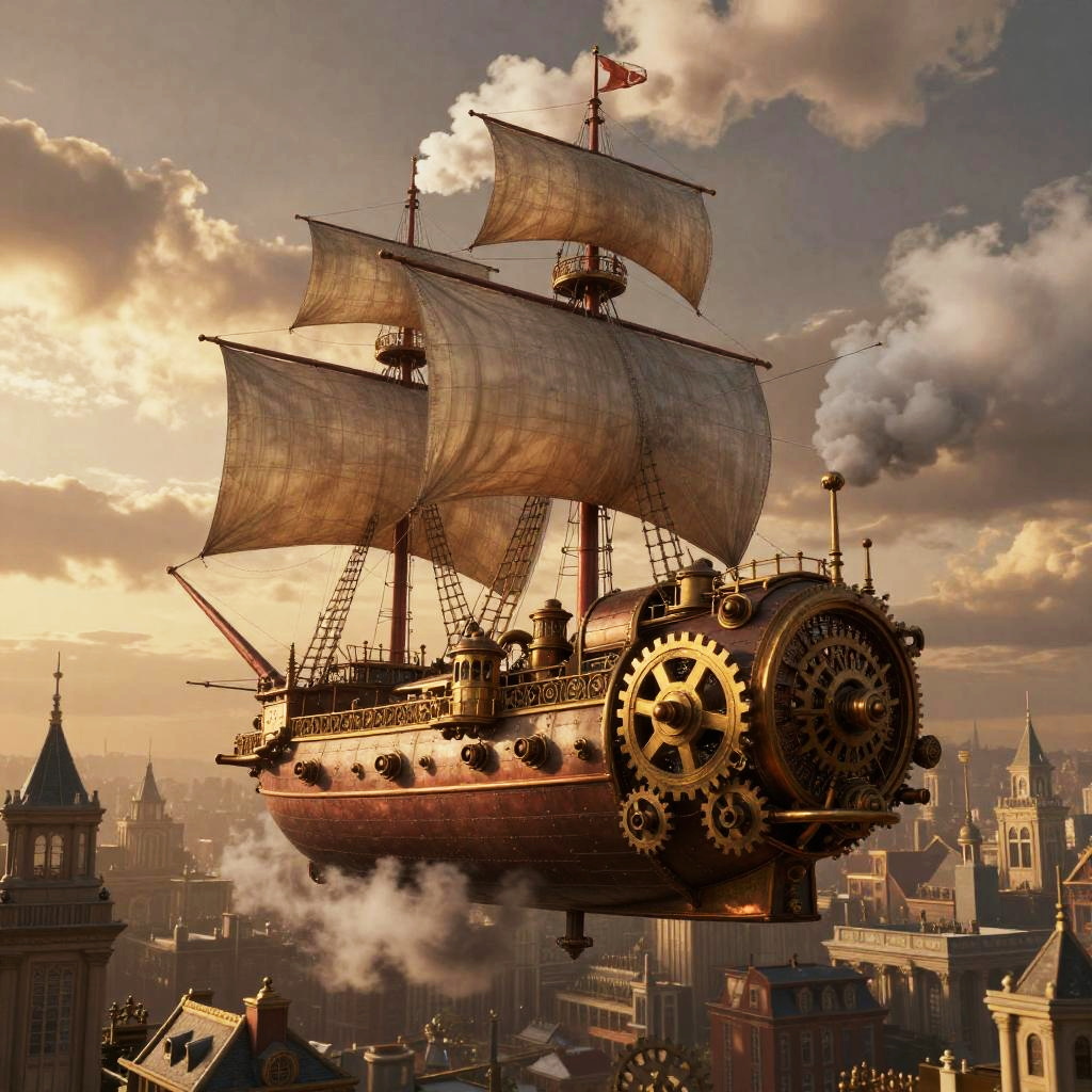 Photorealistic digital artwork of a steam-powered, Victorian-era airship with massive gears and billowing smoke, soaring above a historic cityscape at sunset