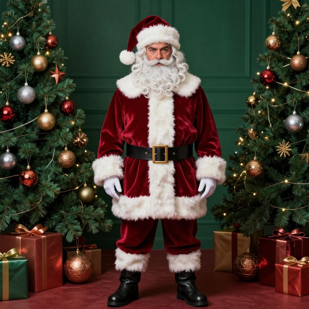(full body view of (Filipino) santa claus), (wearing Christmas themed outfit and accessories, intense stare), best quality, 8k, hyper detailed, ultra high res, photorealistic, high resolution, detailed raw photo, Christmas theme, holiday photo, Crimson, Burgundy, Ruby Red, Hunter Green, Emerald Green, Pine Green, Forest Green, Christmas Green, siver, gold, bronze, copper, rose gold, masterpiece
