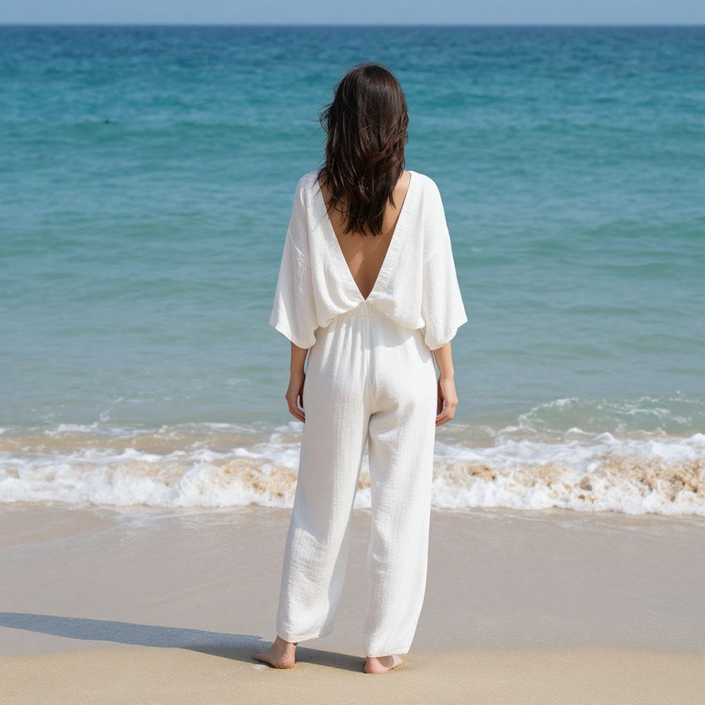 Woman wearing a loose, backless white jumpsuit stands barefoot on a sandy beach, facing the turquoise ocean with gentle waves lapping at her feet.