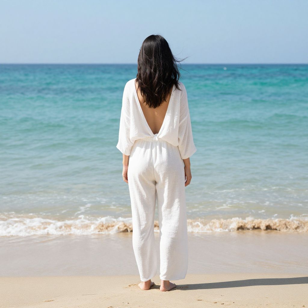 Photograph of a woman with medium-length black hair, standing barefoot on a sandy beach with gentle waves. She faces away from the camera, wearing a white, loose-fitting, backless jumpsuit that contrasts with the turquoise and blue ocean in the background. The clear sky above meets the horizon, creating a serene, peaceful atmosphere. The sand is light beige, and the ocean's surface is calm with small waves. The image emphasizes simplicity and tranquility, with the woman's white attire and the natural beach colors creating a harmonious visual effect.