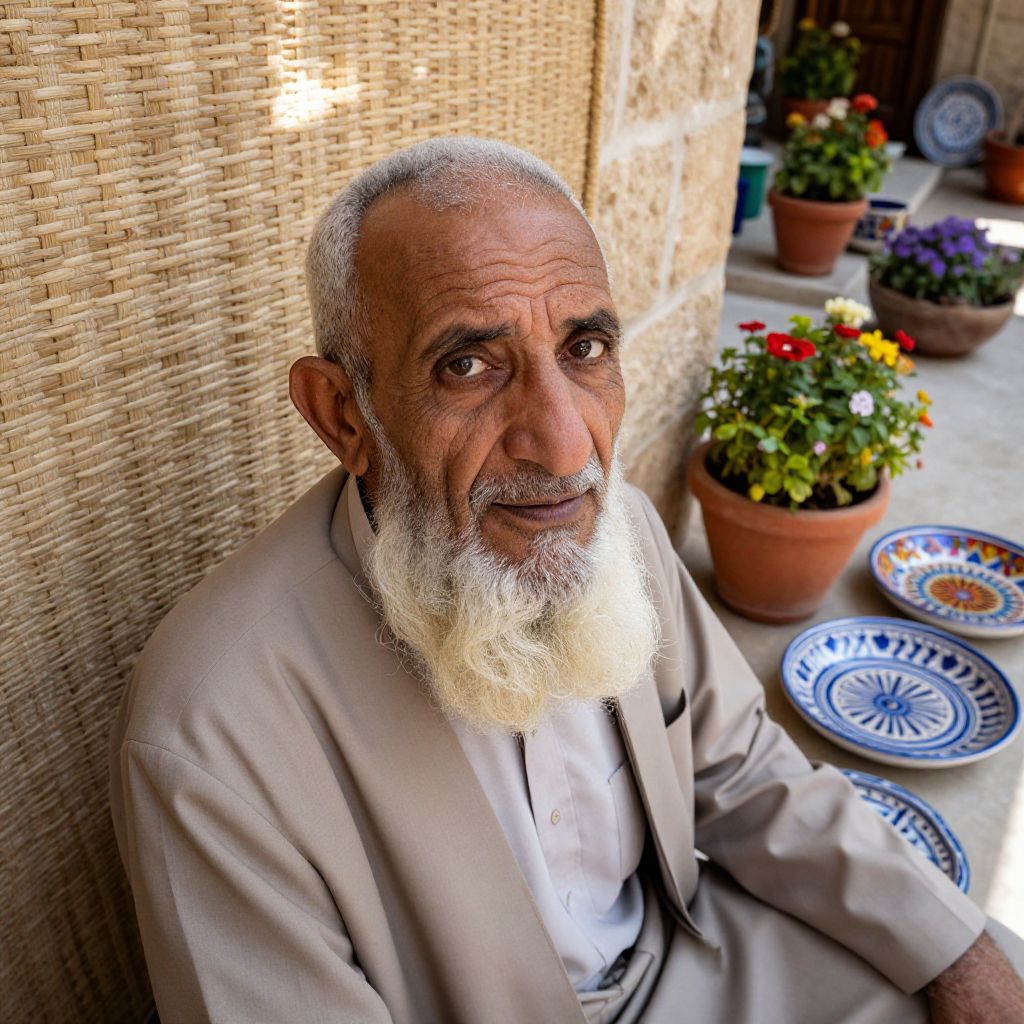 A photorealistic portrait, captured with a DSLR, depicts an elderly Middle Eastern man whose weathered skin and warm brown eyes convey a sense of contemplation. Soft sunlight filters through a traditional woven mat on a stone wall, highlighting his serene gaze as if peering into the depths of life's mysteries. The unique 'bird's-eye view' perspective accentuates the rugged texture of his complexion and the intricate details of his flowing white beard. Amidst a tranquil courtyard adorned with vibrant potted plants and colorful ceramic dishes arranged in geometric patterns, he sits quietly, evoking admiration for his resilience and contemplation on life's passage.