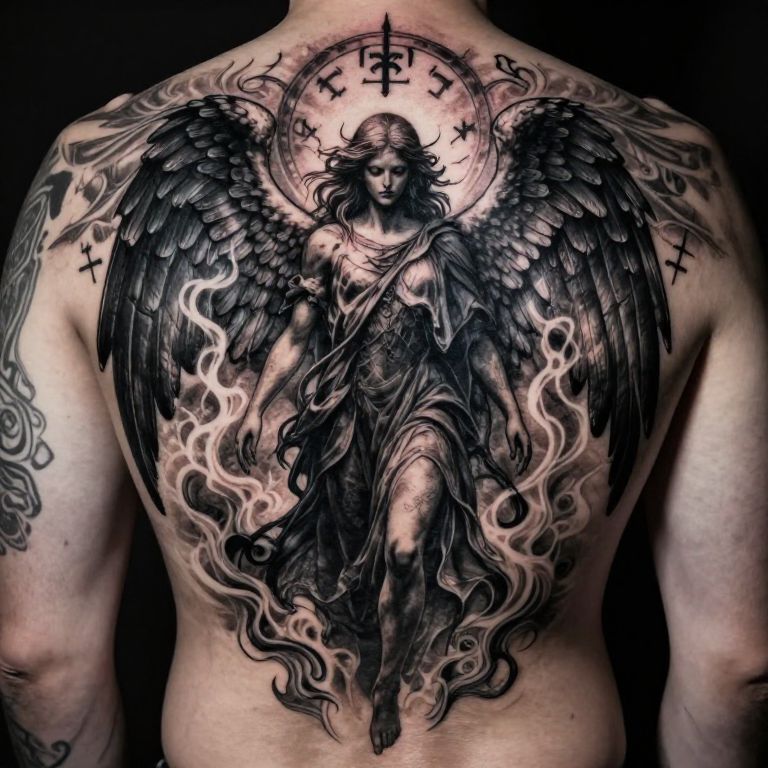 Angel of death tattoo back design featuring a dark, ethereal figure with large, tattered wings, surrounded by mystic smoke and symbols, intricate tribal patterns blending into the skin, dramatic black and grey shading with subtle hints of crimson.