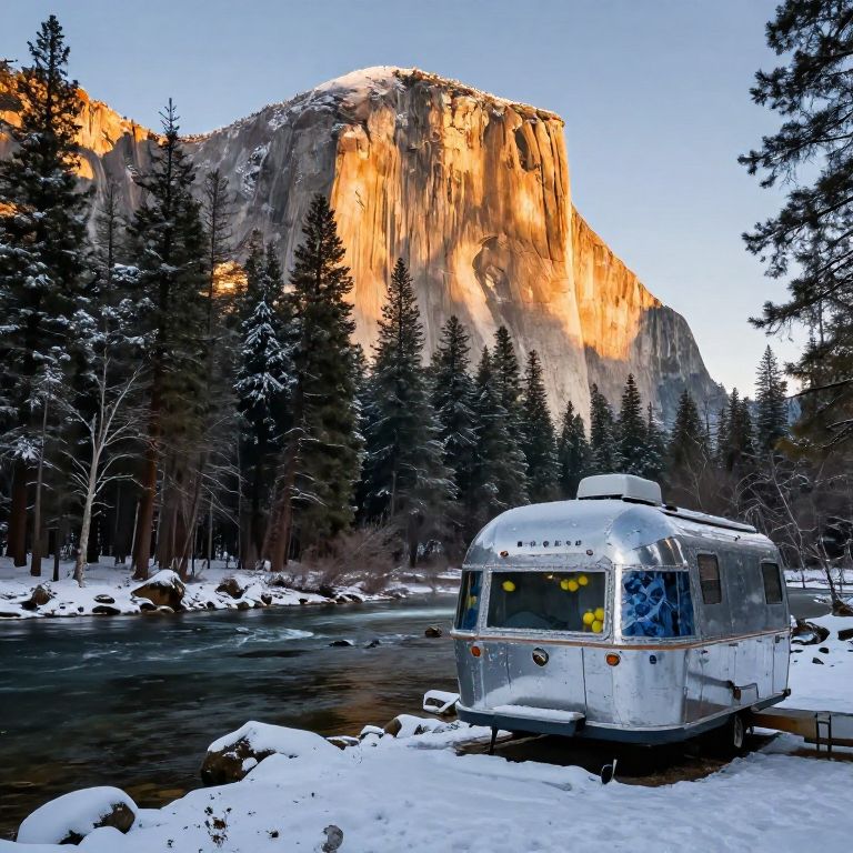 Photograph of a snowy campsite with a vintage trailer beside a river, towering El Capitan cliff illuminated by sunset, surrounded by evergreen trees.