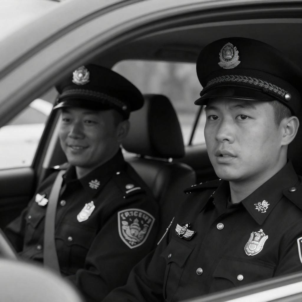 Black-and-white photograph of two male police officers in car, shot from inside. Both wear dark police uniforms and hats. Left officer has light skin, slight smile, short hair. Right officer has light skin, serious expression, slightly open mouth. Dimly lit background. Front seats visible.