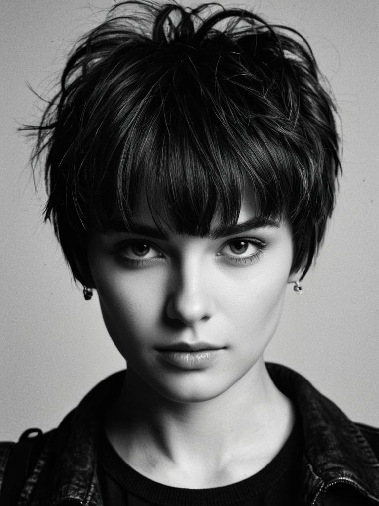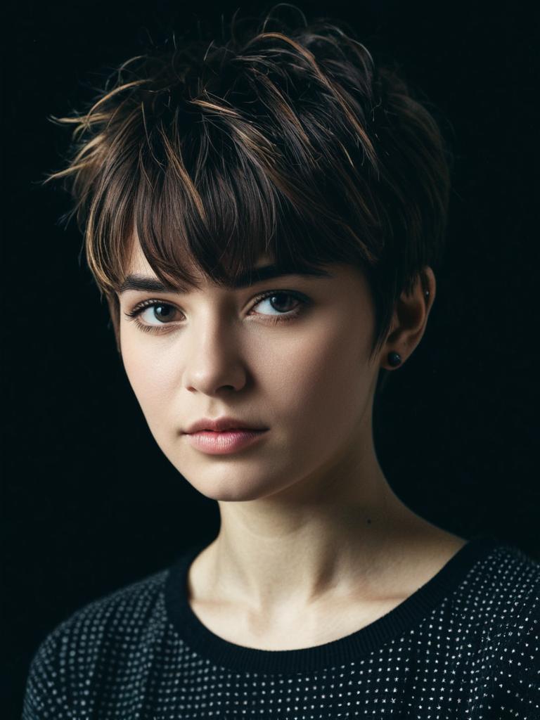 Woman with Messy Pixie Cut and Bangs hairstyle, cinematic realism, studio glamour photo