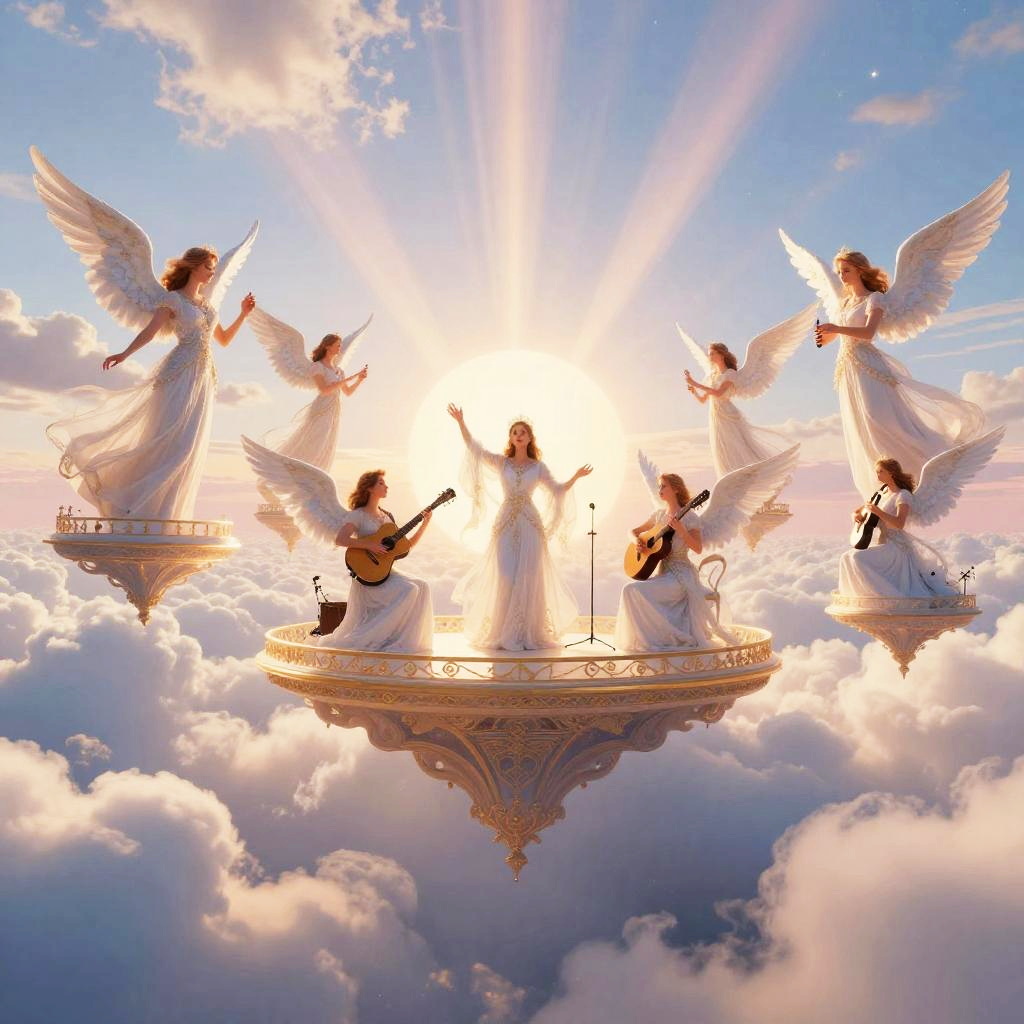 Heavenly celebration with celestial musicians performing on floating platforms, radiant light rays piercing through majestic clouds, elegant angelic figures adorned in flowing gowns, vibrant pastel sky backdrop, tranquil and joyful mood