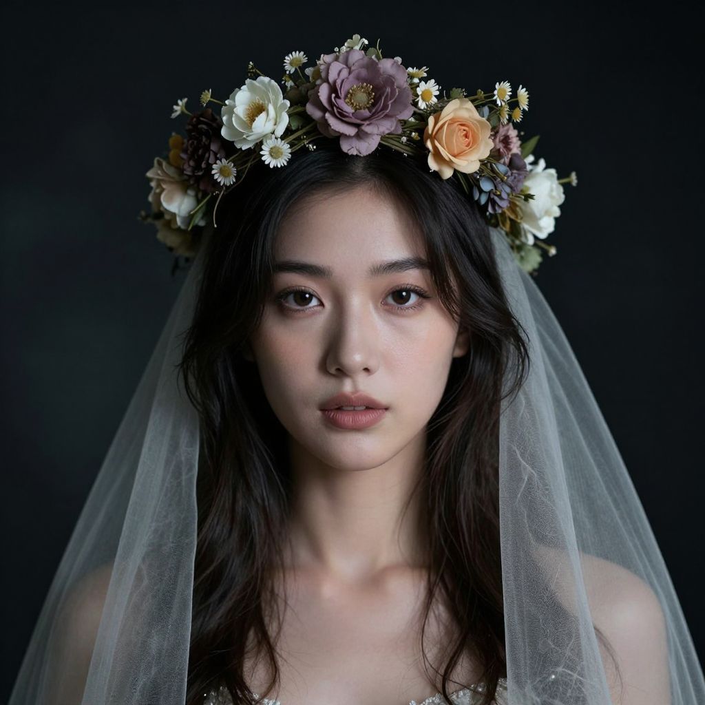Photograph of an Asian woman with long black hair, wearing a floral crown and veil, against a dark background, with a serene, slightly melancholic